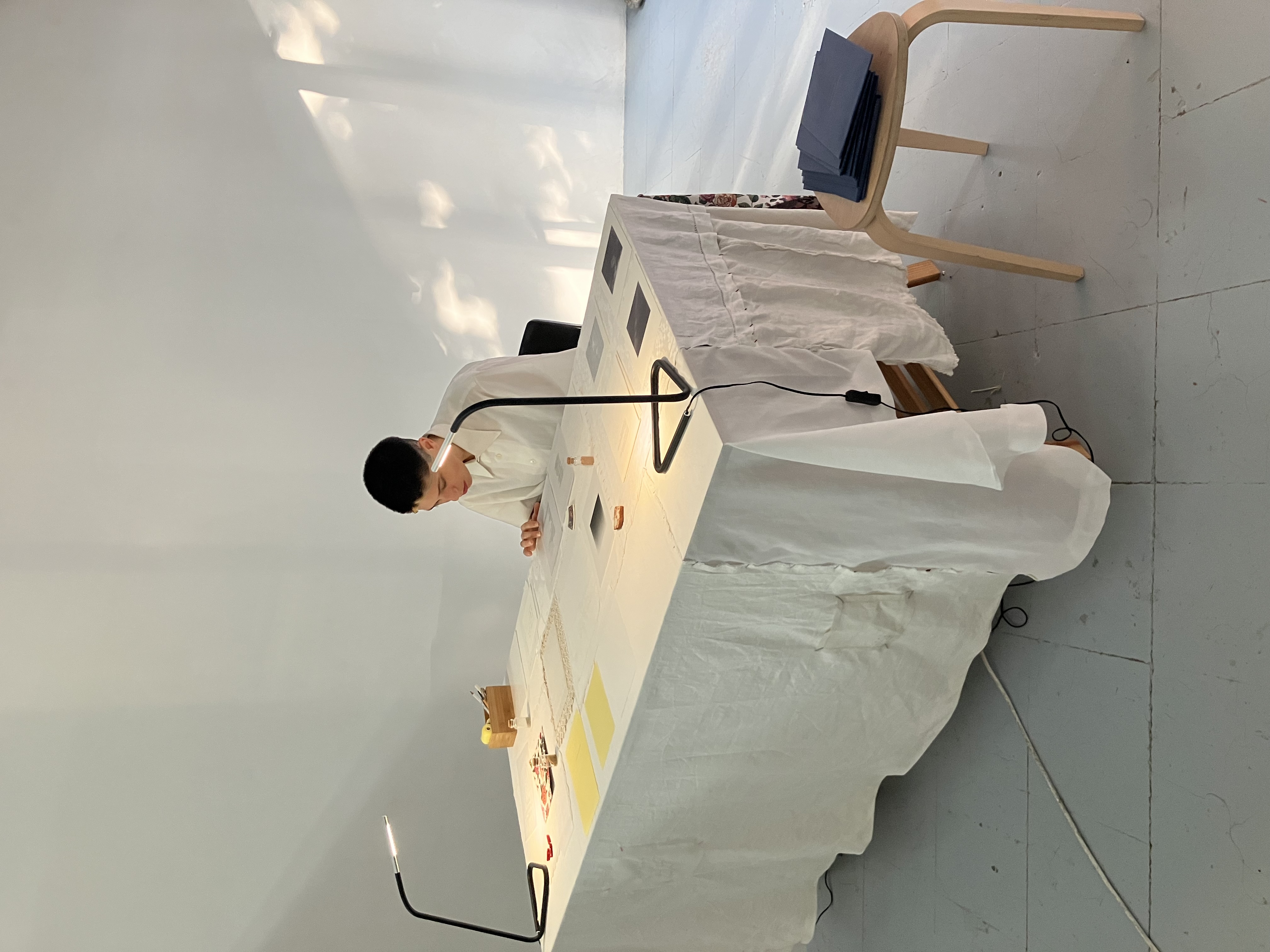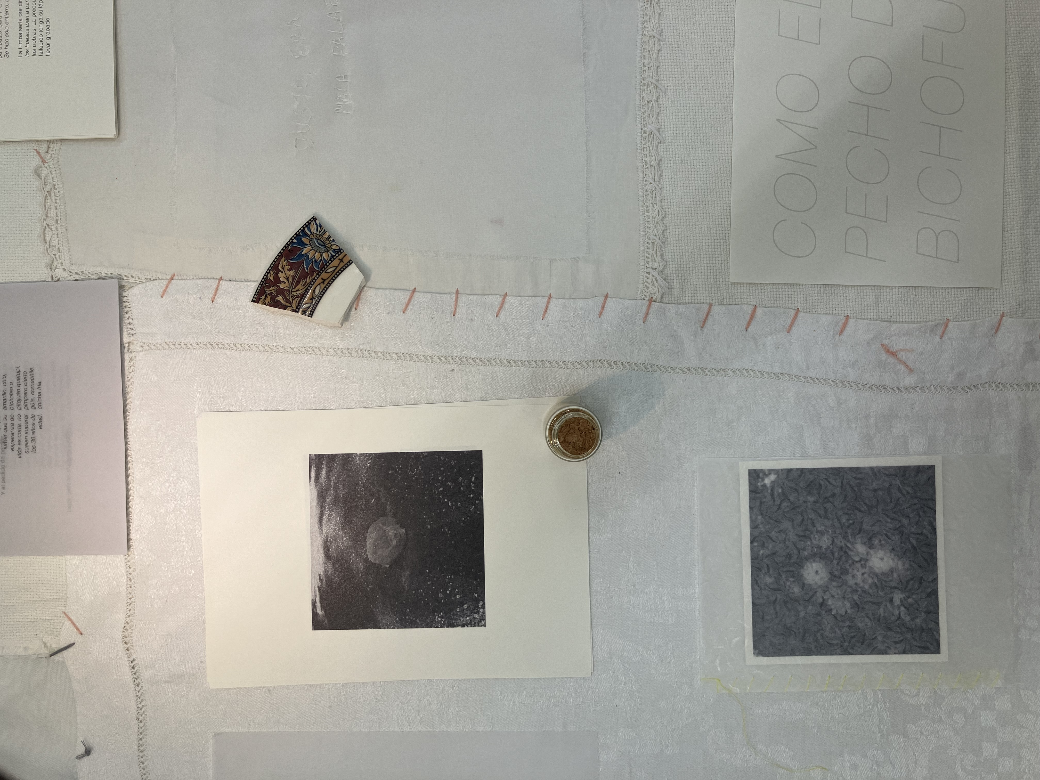Cada una de las artistas se encuentra al llegar al espacio con una mesa donde se reúnen textos, objetos recolectados, registros de video y sonido. Al igual que los objetos, los sonidos fueron también recolectados, registrados y desarmados, para continuar indagando sobre la idea de hogar. Los materiales se encuentran además dispuestos sobre un mantel construido a partir de retazos de telas familiares y piezas encontradas en ferias, pensando en los múltiples manteles que encontramos en cada una de nuestras casas. Me interesa ensayar formas en que los relatos se arman y se desarman sin una forma definitiva, rastrear aquellos momentos en donde la anécdota se transforma, muta, el relato se pierde o se quiebra.