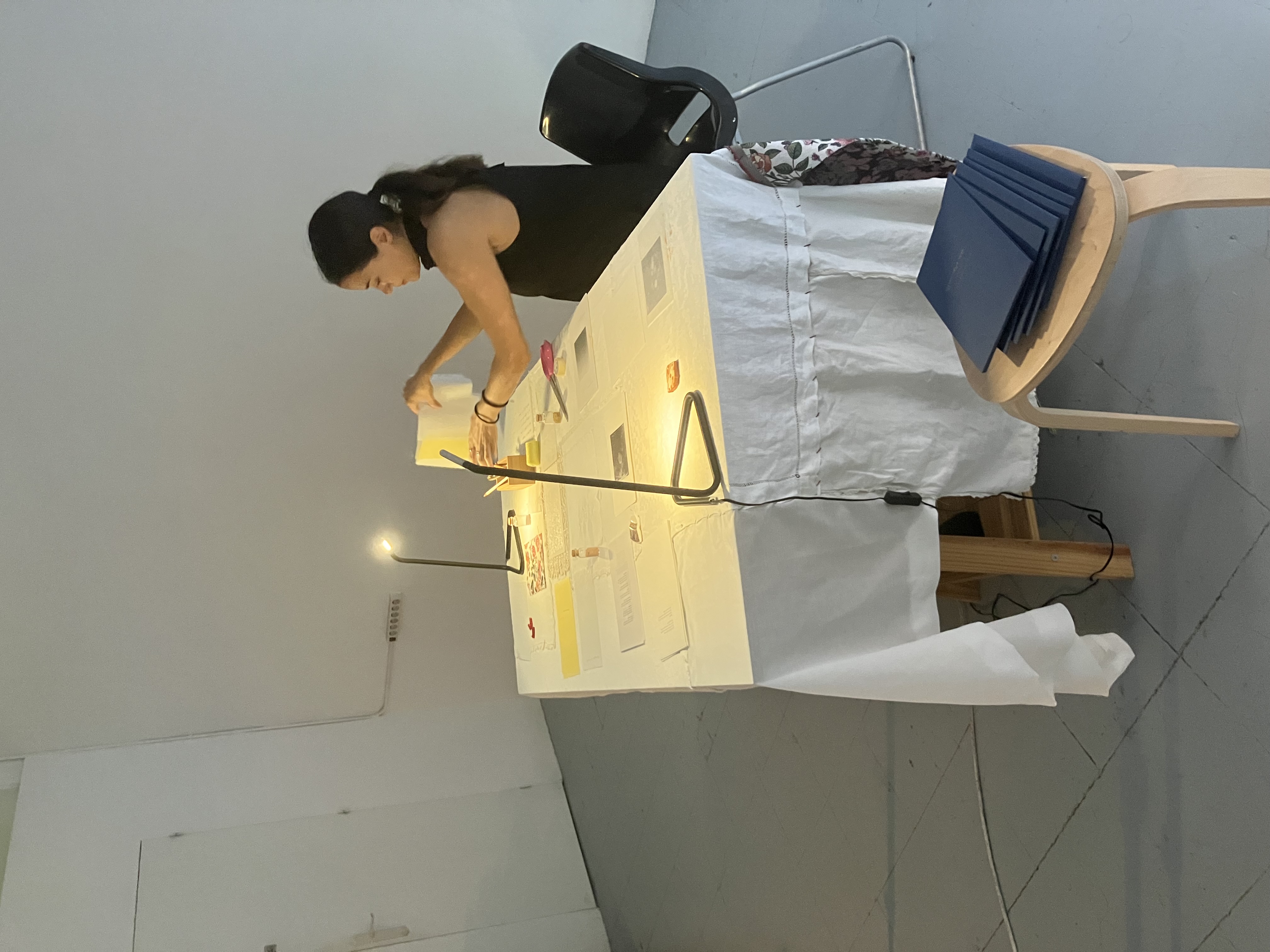 En el contexto del Reading Room 2023 en Tangent Projects, convoqué durante una semana a diez mujeres artistas, escritoras y curadoras en una instancia individual, dando lugar a diez libros colaborativos que reflejan diferentes maneras de reunir los materiales y textos propuestos y de proponer diferentes relatos. El proyecto propone a cada una de ellas entretejer nuevas historias y reflexionar sobre el concepto de hogar, identidad, de movimiento y de nación, así como también sobre la búsqueda de volver algo portable (un objeto, una casa o un recuerdo quizás) para construir nuevos relatos. En línea con lo anterior, me interesa indagar en el rol de la mujer como guardiana y transmisora de la memoria, que tiene en la diosa Mnemósine una de las personificaciones más destacadas y reflexionar sobre la transmisión oral como aquello que se va disgregando a otros espacios.